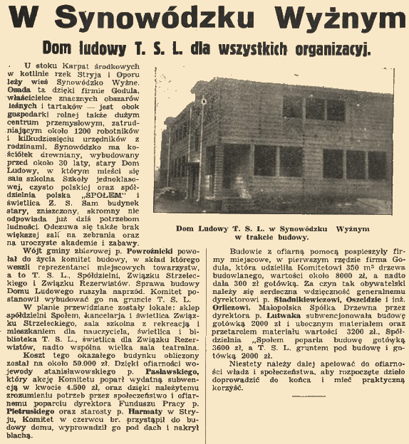 On the slope of the Central Carpathians, in the basin of the Stryja and Opor rivers, lies the village of Synowódzko Vyšné. This settlement, thanks to the Godula company, owner of large areas of forest and sawmills - is, besides agriculture, also a large industrial centre, employing about 1,200 workers and dozens of clerks with their families. Synowódzko has a wooden church, built about 30 years ago, an old People's House which houses the schoolroom of a one-classroom, purely Polish school, as well as the "Społem" Polish Cooperative and the Z.S. day-room. The old, dilapidated, modest building itself no longer meets the needs of the population. It also suffers from the lack of a larger hall for meetings and for ceremonial academies and games.