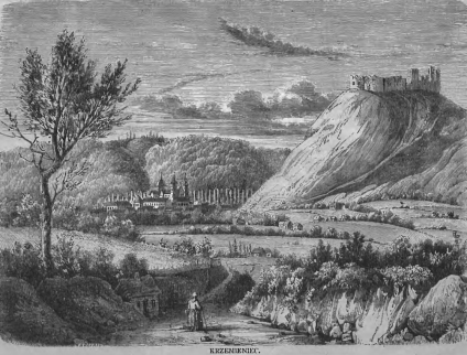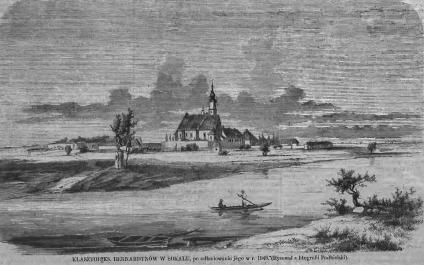 The text describes Ryshchev, situated 'in the Kiev province', a town where in 1763 a monastery and a wooden church were founded by the starosts of Traktymir, Stanisław and Ursula Szczeniowski, née Nitoslawska. (Source: Tygodnik Illustrowany, Warsaw 1863, T:7, p. 220., after: Digital Library of the University of Łódź)