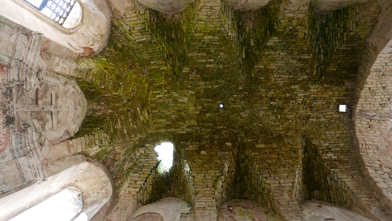 Vue intérieure de l'église de la Sainte-Trinité à Podhajce, Ukraine, montrant le plafond voûté avec des dommages visibles et des sections manquantes. La maçonnerie est exposée et la lumière entre par de petites ouvertures. Photo montrant Podhajce (Ukraine) - Église de la Sainte-Trinité Galerie de l\'objet +9