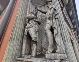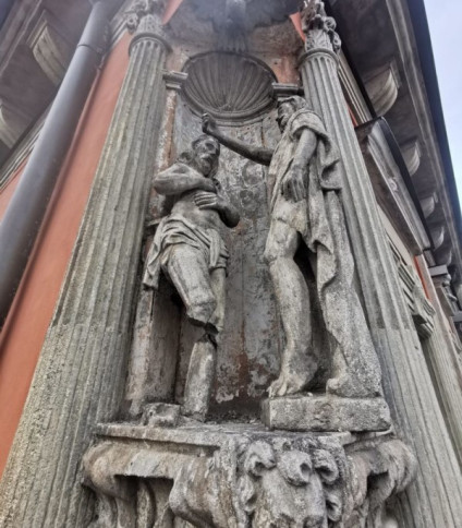 Conservation d'un fragment de la façade de la maison d'habitation Szolc-Wolfowicz avec la sculpture "Baptême du Christ".