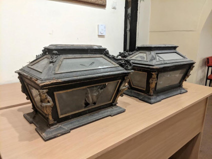 Conservation d'un tableau de la chapelle Kampianov avec un cadre doré et de deux reliquaires de la cathédrale latine de Lviv