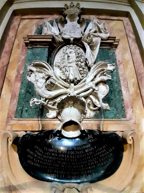 Nagrobek Władysława Konstantego Wazy w kościele Sacre Stimmate di San Francesco w Rzymie. Ozdobny nagrobek z rzeźbionym portretem, elementami dekoracyjnymi i inskrypcją po łacinie. Fotografia przedstawiająca Nagrobek Władysława Konstantego Wazy Galeria obiektu +6