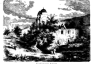 Rycina przedstawiająca Mozyr z kościołem z kopułą i krzyżem, otoczonym drzewami i płotem. Dwie postacie idą ścieżką prowadzącą do budynku. Niebo jest pochmurne. Fotografia przedstawiająca Opis Mozyru Galeria obiektu +1