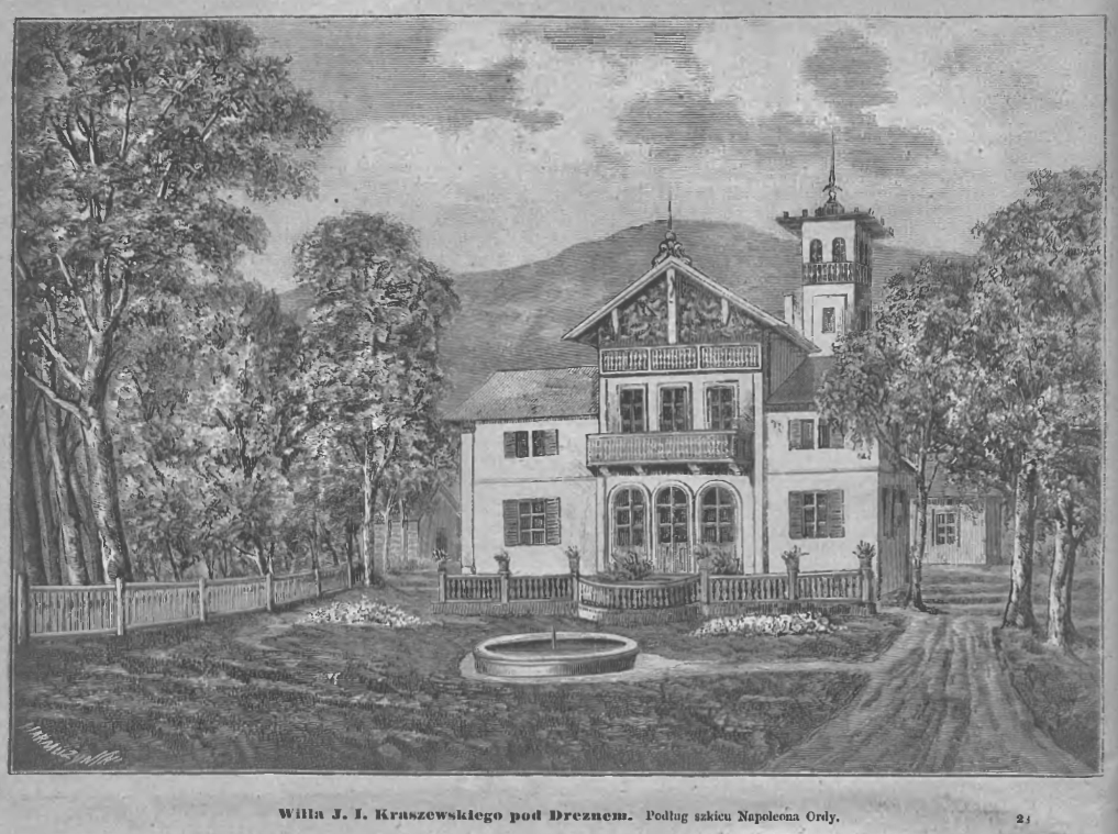 Текст описує "скромну" резиденцію Крашевського, розташовану за межами Дрездена, біля лісу, недалеко від річки Брізніц (Бжезниця) (Джерело: Tygodnik Illustrowany, Warszawa 1879, Series 3, T:7, p. 70, за: Цифрова бібліотека Лодзинського університету).