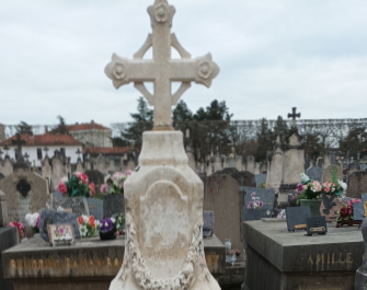 • Wapienna stela zwieńczona krzyżem na grobie Stefana Paszkowicza w Roanne, Francja. Stela otoczona innymi grobami z kwiatami i tabliczkami.